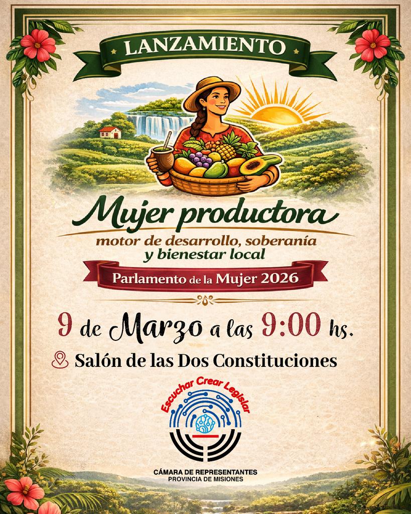 La Cámara de Representantes de Misiones realizará este lunes 9 de marzo, a las 9, el lanzamiento del Parlamento Provincial de la Mujer 2026, bajo el lema Mujer productora, motor de desarrollo, soberanía y bienestar local.